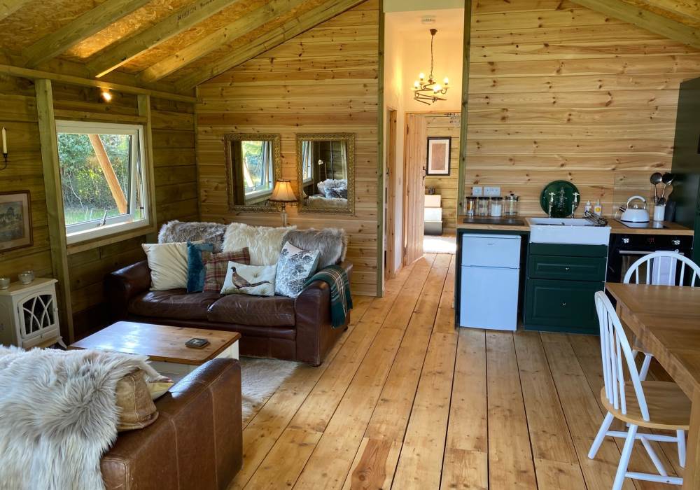 Built in 2022, this attractively furnished and well appointed bespoke built lodge offers an open plan family living area with a modern kitchen with oven, hob and fridge. With a farmhouse table and comfortable seating everyone can come together and enjoy the moment. Full length patio doors open up to a raised decking area with ample seating for the whole family to sit and soak up the open views and enjoy the natural and relaxed rural setting.