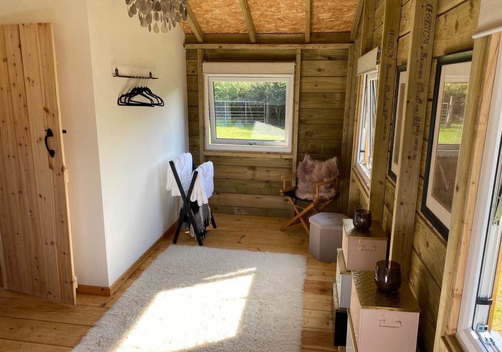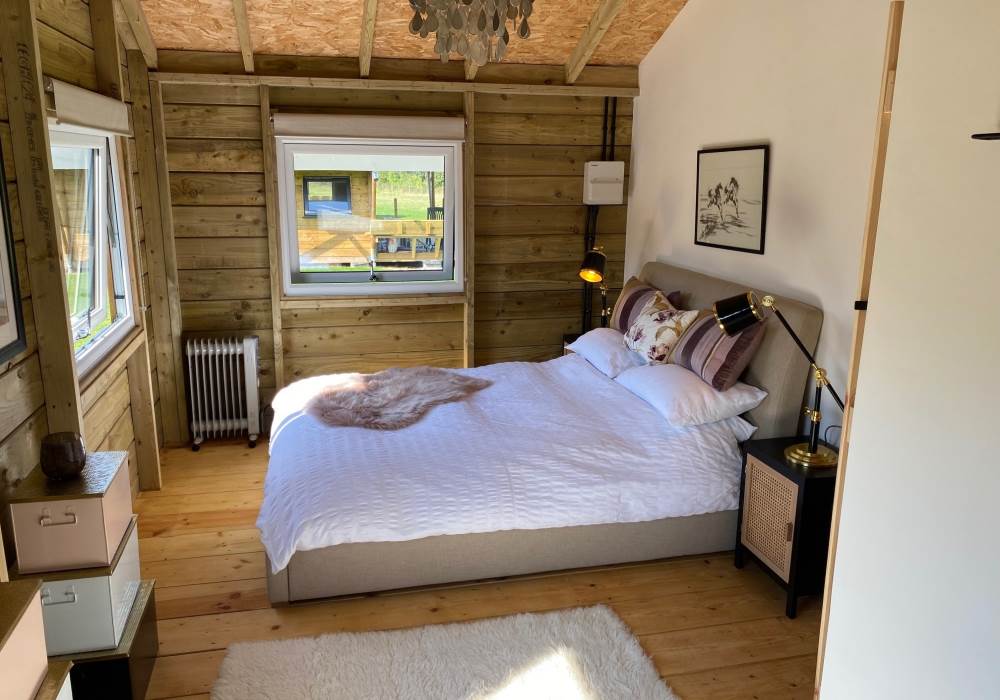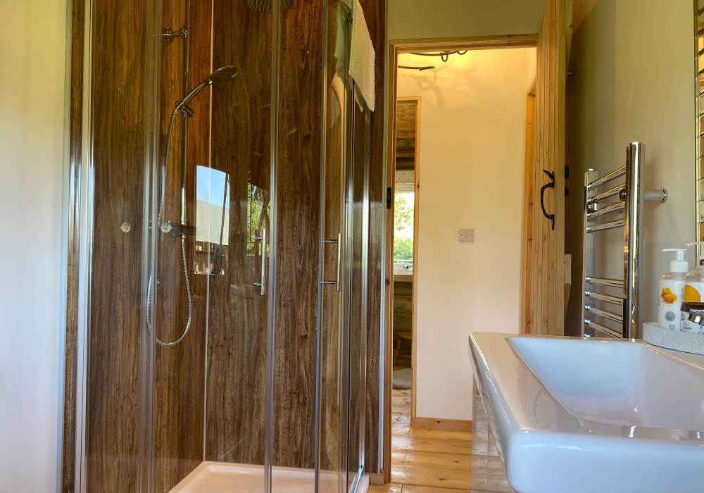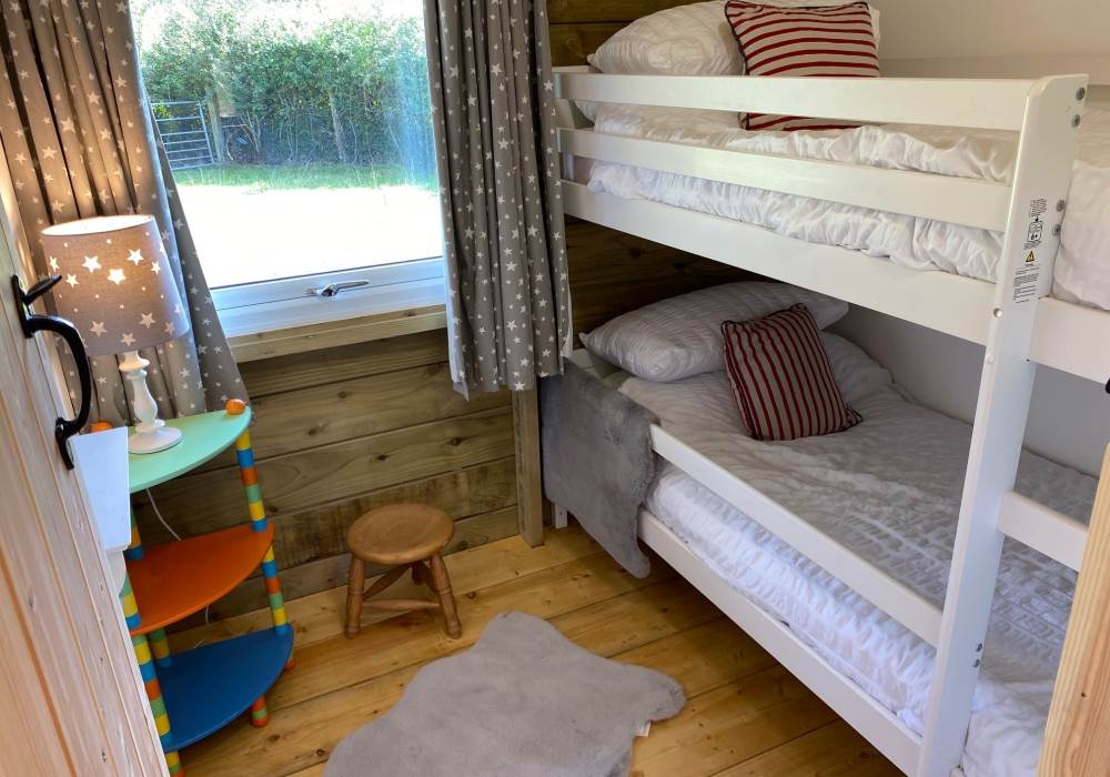 A spacious master bedroom with double bed and additional space for a travel cot or trundle bed (so will sleep up to 5). The second bedroom is set up with a bunk beds making this ideal for children. A modern shower room with flushing loo and wash basin only completes the luxury glamping experience which awaits you.