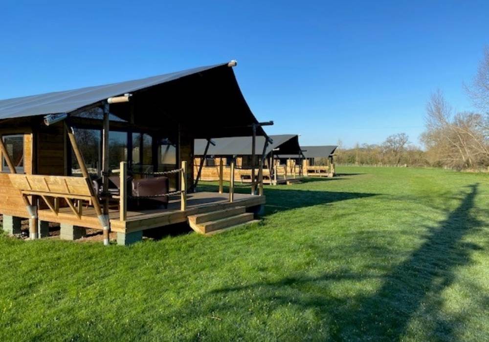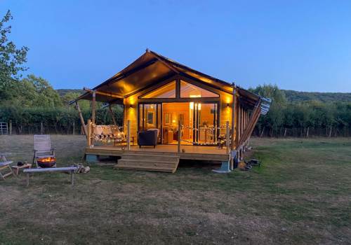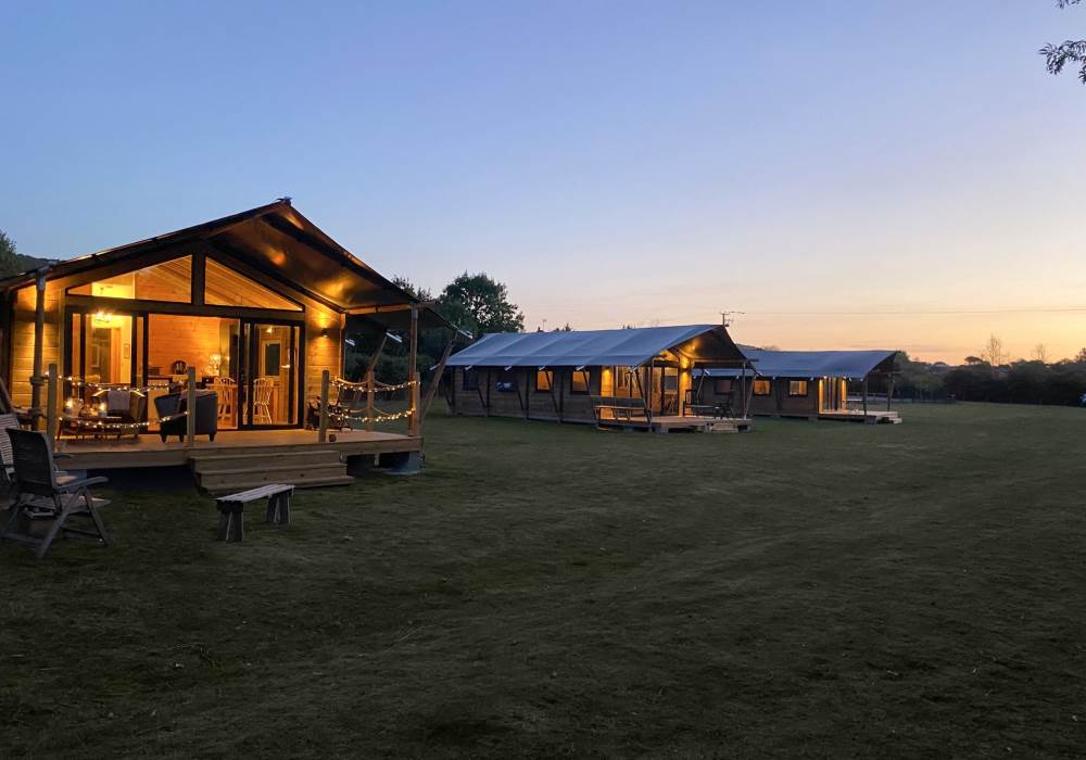 COSY TIMBER SAFARI LODGES, SURROUNDED BY MEADOW AND ORCHARDS, NESTLING IN THE HEART OF SOMERSET.