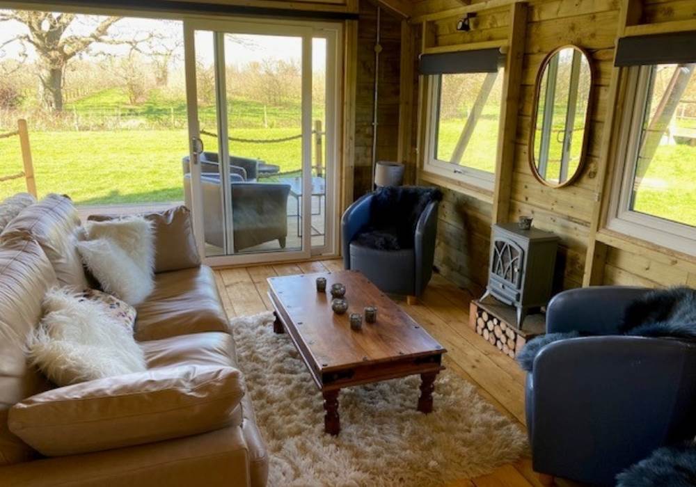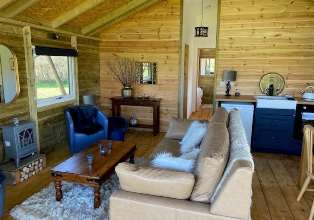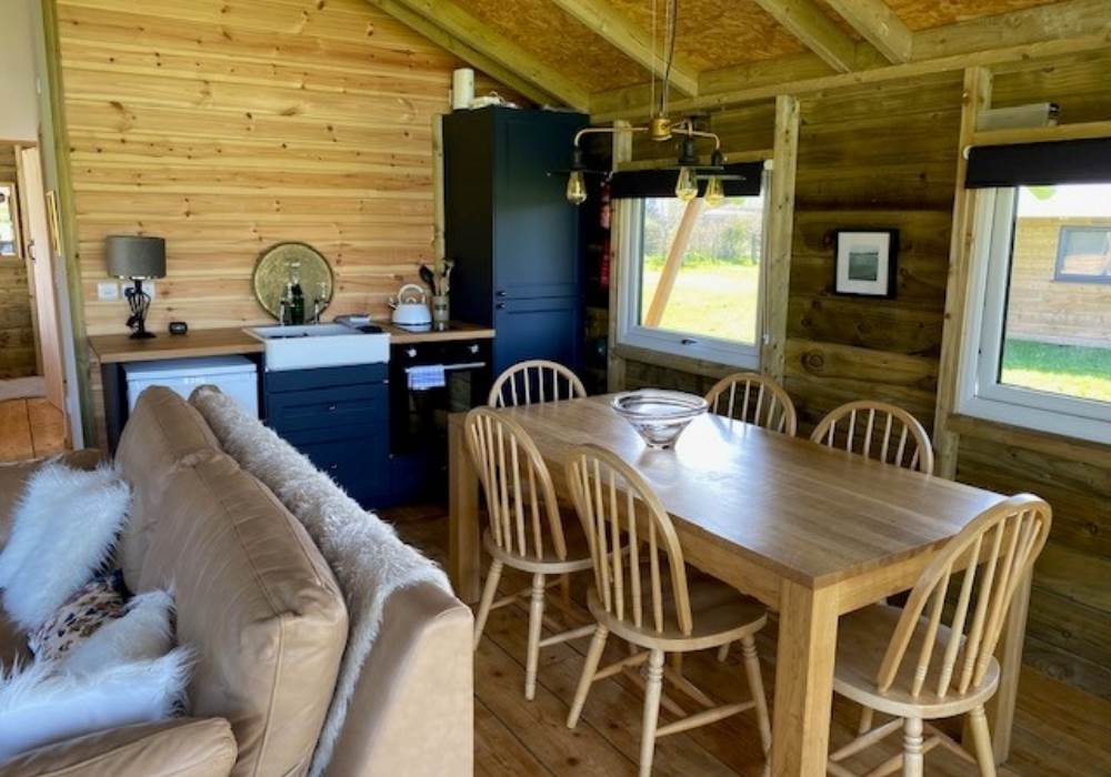 You are warmly welcomed to this attractively furnished and well appointed bespoke lodge built in 2022. On arrival you will find a good sized raised decking area with a comfortable seating area where the whole family can soak up the open views and enjoy the natural and relaxed rural setting. Enter the lodge through full sized patio doors with a glazed gable window above into a spacious, open plan family living room with farmhouse table and comfortable seating for the whole family. Whilst you enjoy a glass of wine, why not rustle up a culinary delight using the modern kitchen with hob, oven and fridge. Alternatively, order a takeaway to be delivered to the site by a number of local restaurants. Either way, kick back and enjoy the moment of luxury glamping.