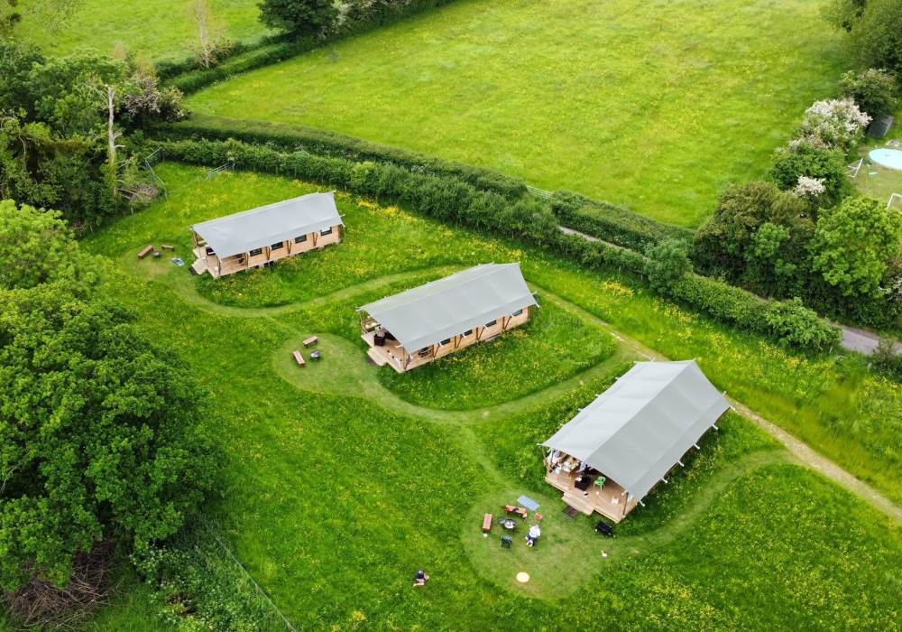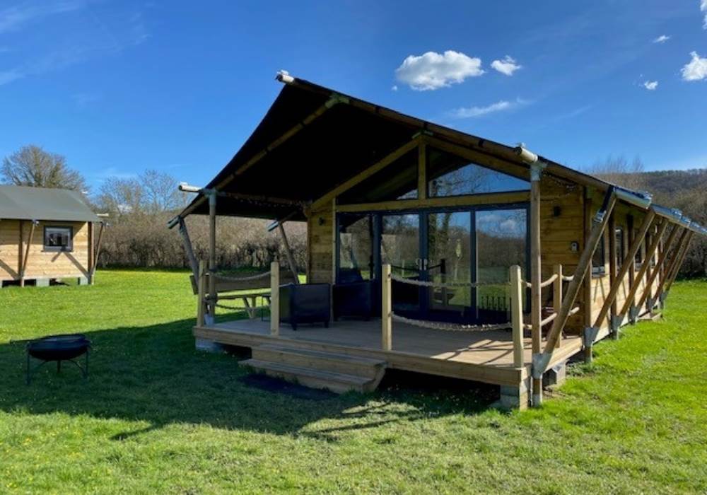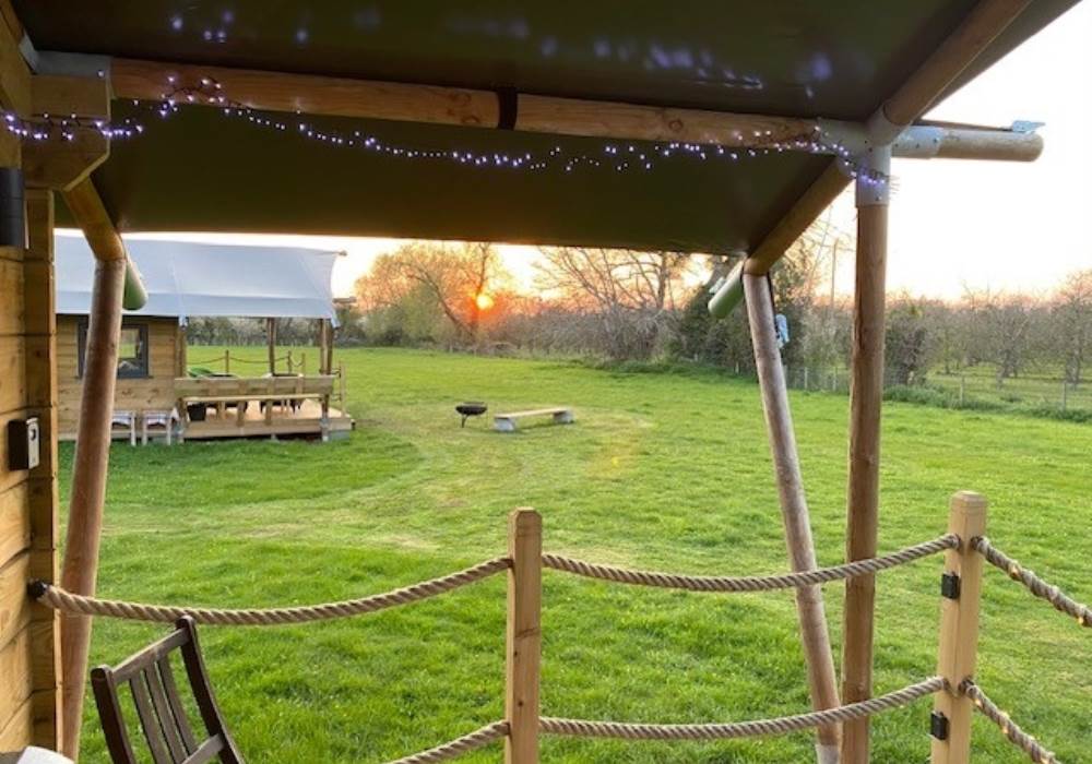 COSY TIMBER SAFARI LODGES, SURROUNDED BY MEADOW AND ORCHARDS, NESTLING IN THE HEART OF SOMERSET.