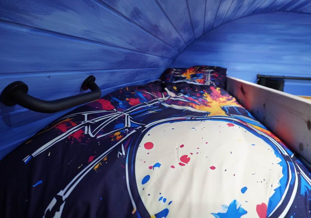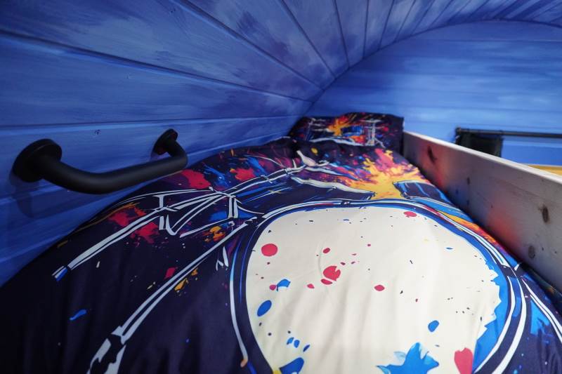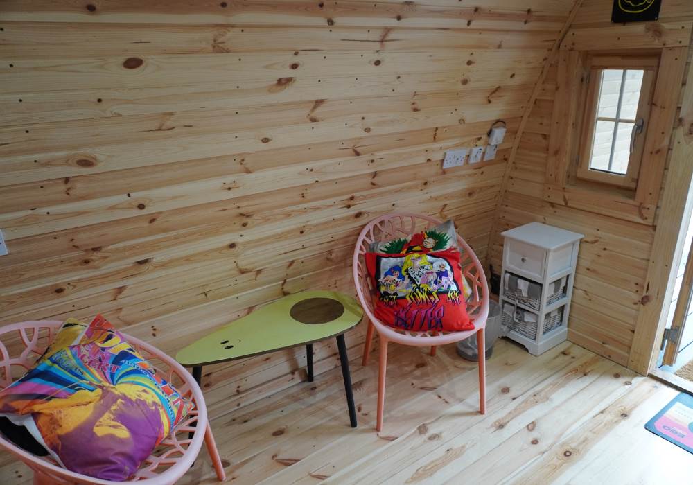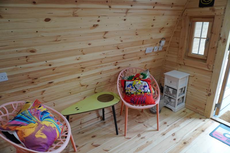 As with all our pods, Pod Stewart offers a cozy living area and a bedroom that sleeps four in a comfy double bed and a fun bunk bed (single on the bottom, small-single on the top) For larger groups a pull-out sofa bed is available in the living area. The pod features a covered over deck area at the front allowing guests a place to unwind in the outdoors. It is well insulated and has its own thermostatically controlled central heating system making it comfy and cosy all year round.