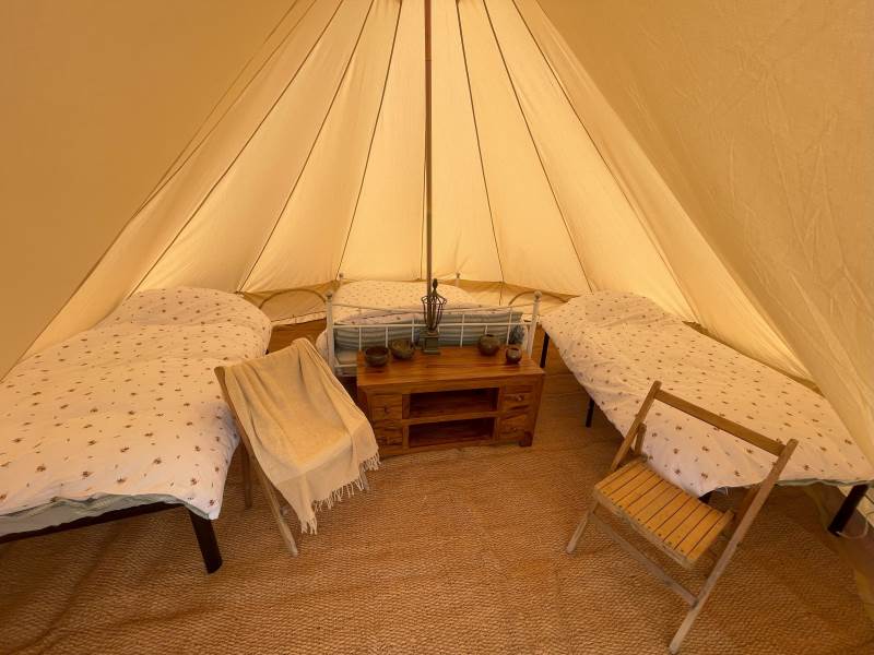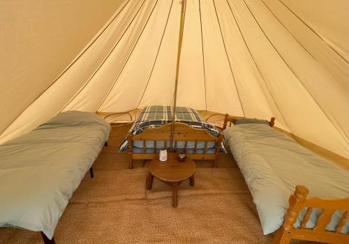Nicely furnished bell tent with one double bed and two single beds.