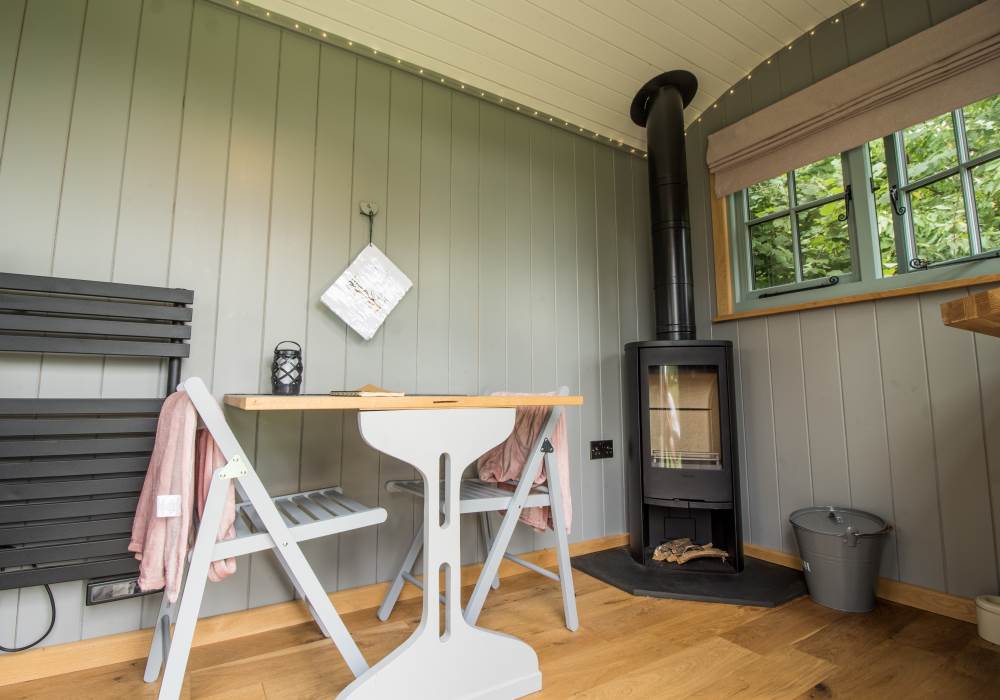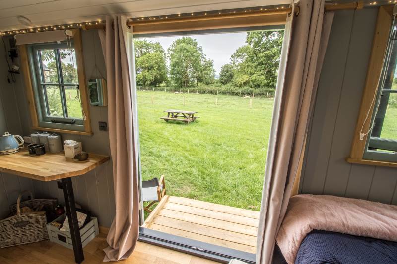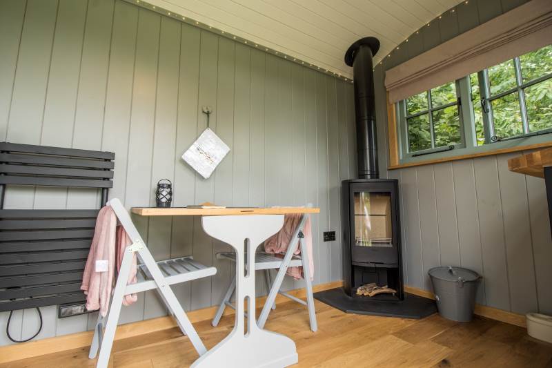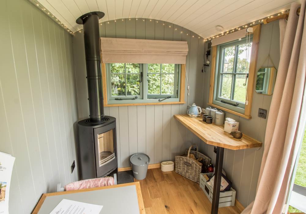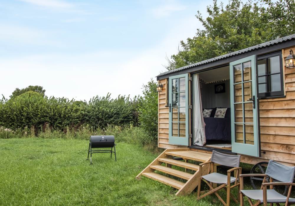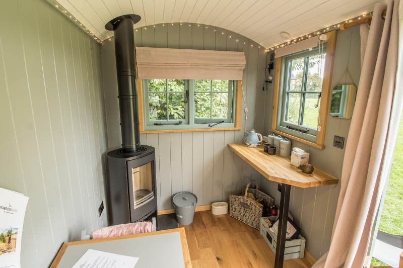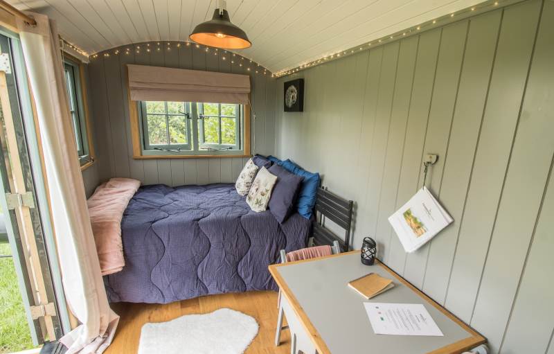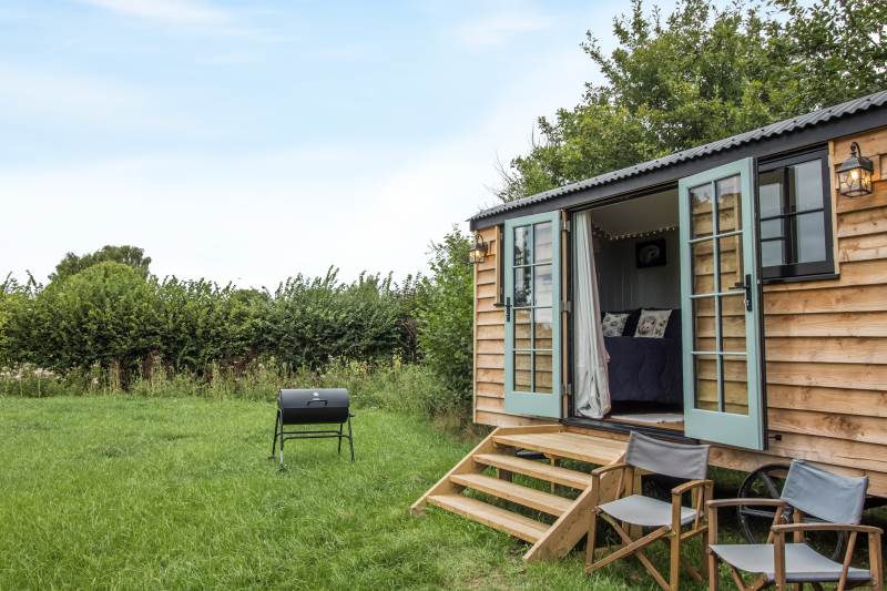 The shepherds hut sleeps 2 with one double bed complete with thick, warm, duvets, pillows and linen. We do have travel cots available for younger guests. Outside your hut there is a lovely area with 2 directors chairs to sit and enjoy a glass of wine as well as a picnic table, your own barbeque and your own fire pit to toast those marshmallows over.